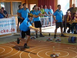 beim letzten Spiel gegen den FC Penzing unbedingt ein Sieg vor heimischem Publikum notwendig, um den Klassenerhalt zu sichern. Rund 160 Zuschauer begrüßte unser Moderator Willi Huber. Sie erlebten in unserer Halle Sport auf höchstem Niveau. Nach sehr starkem Beginn der Gäste aus Penzing ging das 1. Spiel trotz 6 : 0 Führung unseres Teams, das mit Florian, Albert, Günther und Alex (Auswechselspieler Max) auf der Bahn war, noch mit 9 : 11 Punkten an die Gäste, allerdings mit großem Pech: Der Stock vom 2. Stockschützen Alex, der zielsicher bis ca. 1,5 m vor dem gegnerischen Stock in der Spur lag, stellte sich auf und übersprang den Peitinger Stock. Statt 9 : 0 stand es nun 6 : 3. Diese Irritation war ursächlich für den Verlust dieses Spiels. Die beiden folgenden, fehlerlos seitens unserer Moarschaft geführten Spiele gingen souverän mit 14 : 3 und gar 19 : 3 Punkten an unsere Mannschaft, was die 2 : 1 Führung brachte. Nicht unerheblichen Anteil dabei hatte 1. Stockschütze Albert Huber, der mit seinen Barschüssen (97% Trefferquote!!) seinen Mannschaftskameraden große Sicherheit verlieh. Ein weiteres gewonnenes Spiel bedeutete nun den Klassenerhalt. Trotz dieser Nervenbelastung und Steigerung des zwischenzeitlich etwas außer Tritt geratenen Penzinger Teams wurde das 4. Spiel mit 16 : 8 Punkten gewonnen und der Verbleib in der 1. Liga war gesichert. Das nun ziemlich bedeutungslos gewordene 5. Spiel ging mit 14 : 10 an die Gäste. Nach Beendigung des Spiels stieg die Spannung bei beiden Mannschaften extrem, da nun die Teilnahme am Viertelfinale für Aigen und der Verbleib in der 1. Liga für Penzing vom Ausgang der Begegnung des TSV Peiting mit dem EC Surheim abhing. Nach ca. 10 Minuten war folgendes klar: Aigen steht im Viertelfinale gegen EC EBRA Aiterhofen am 16. Juni in Aiterhofen und der Aufsteiger FC Penzing verbleibt in der 1. Liga. Beide Mannschaften gratulierten sich gegenseitig zum jeweiligen Erfolg. Absteiger in dieser Gruppe ist der EC Surheim.