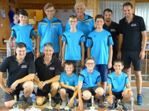 Regelmäßig am Freitag von 15.30 bis 16.30 Uhr trifft sich unser Nachwuchs in der Stocksporthalle zum Training unter Trainingsleiter Willi Huber und Stellvertreter Alex Madl. Für Freitag, den 5. Juli hatten die sich etwas Besonderes einfallen lassen. Zum Training waren ausser den Buam auch 4 Spieler der 1. Mannschaft, die seit Jahren in der 1. Bundesliga erfolgreich sind, im Sportdress und mit Stockausrüstung erschienen: Florian Brundobler, Albert Huber, Günther Krennleitner und Alex Madl. Beim anschließenden Training konnten diese 4 den Jungschützen viele hilfreiche Tips zu allen anfallenden Fragen und zur Lösung verschiedenster Probleme geben. Dann wurde es ganz besonders spannend, denn es wurden zwei Mannschaften mit jeweils 2 BuLi-Schützen, 4 bzw. 3 Jungschützen, ergänzt mit Trainer Willi Huber zusammengelost. In dem spannenden Zweikampf, der bei den Jungschützen schon so manches Talent aufblitzen ließ, trennte man sich schließlich fast unentschieden mit 15 : 13. Eines steht mit Sicherheit fest: Dieses Training wird sehr lange in Erinnerung bleiben.