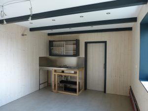 Dann wurde alter Estrich entfernt und neuer eingebracht sowie die Fliesen verlegt. Nach Neuinstallation von Sanitär- und Elektroinstallation wurden die Wände wie auch die völlig neu gestaltete Decke gut isoliert und neu verschalt (Holz und Rigips). Viele Materialien mussten dazu antransportiert werden. Die Garderobe wurde aus dem Raum ausgegliedert. Lieferung und Einbau der Einrichtung ist für die 39. Kalenderwoche zugesagt.